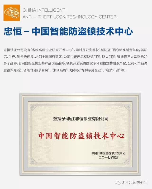 忠恒,专业研发,生产,销售防盗门锁,防火门锁,智能锁的厂家。自1992年公司诞生以来一直秉承“一把忠恒锁,安心一家人”的经营管理理念精工铸造。以技术为先导,重视技术人才投入。公司设有“省级高新企业研究开发中心”同时也是公安部“机械防盗门锁”标准制定单位,公司始终坚持 “视质如命”的经营理念,全心全力让每一把锁成为经典,以人文赋予产品高度的生命力,以其专业制造成为门锁行业领航品牌,先后获国家高新科技企业,中国智能锁知名品牌,浙江知名品牌,中国锁具最具影响力品牌等荣誉。忠恒凭借较好的基础,在众多智能指纹锁品牌中脱颖而出。