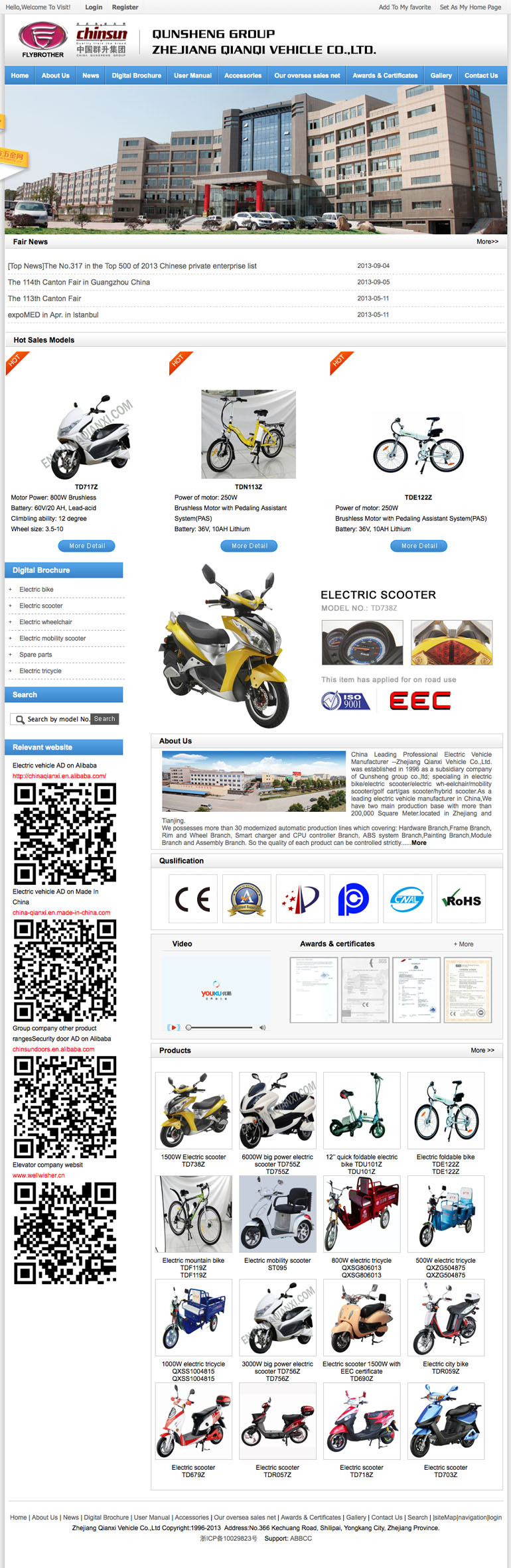 浙江千喜车业有限公司是全国民营企业500强之一,公司坐落在浙江永康经济开发区,是该市五家航母型企业之一。浙江千喜车业有限公司拥有员工4000多人,生产场地50多万平方米。浙江千喜车业有限公司主导产品为小飞哥牌系列电动车,93年开始投资、研发生产,是国内较早产业化生产电动自行车的企业之一,企业规模位列全国第一,05年产销量在全国自行车行业协会信誉标志企业中位列第三。浙江千喜车业有限公司连续十七年荣获永康市纳税大户称号,10年公司纳税达8000万元。