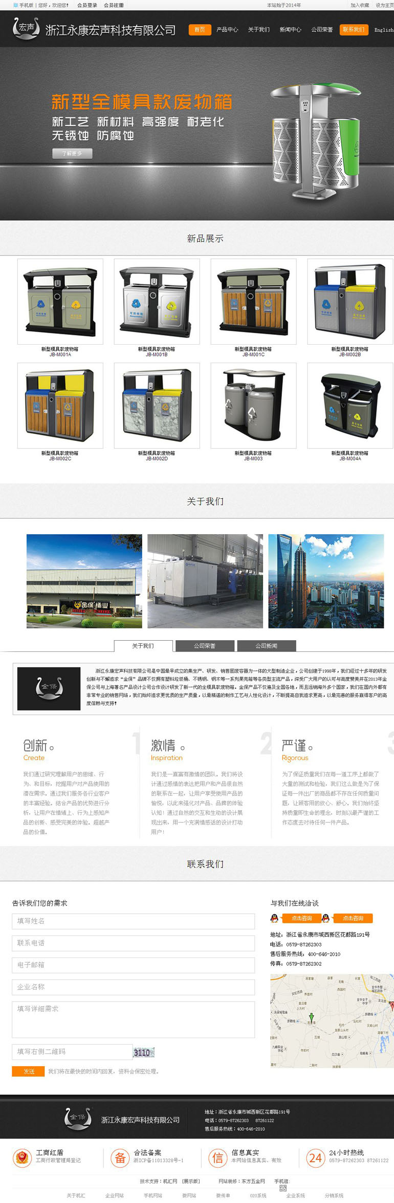 浙江永康宏声科技有限公司成立于1998年,地处“中国科技五金之都“——永康市城西新区。厂房占地面积15000平方米,备有专业先进五金机械设备和木工设备,拥有由专业高级工程师和具有多年制作经验的生产工人所组成的生产队伍。主要生产以不锈钢、钢木等材质制成的垃圾桶、客房垃圾桶、园林户外系列产品,深得广大用户的认同。 产品同时在机场、银行、会议中心、学校及住宅小区等场所得到广泛应用。