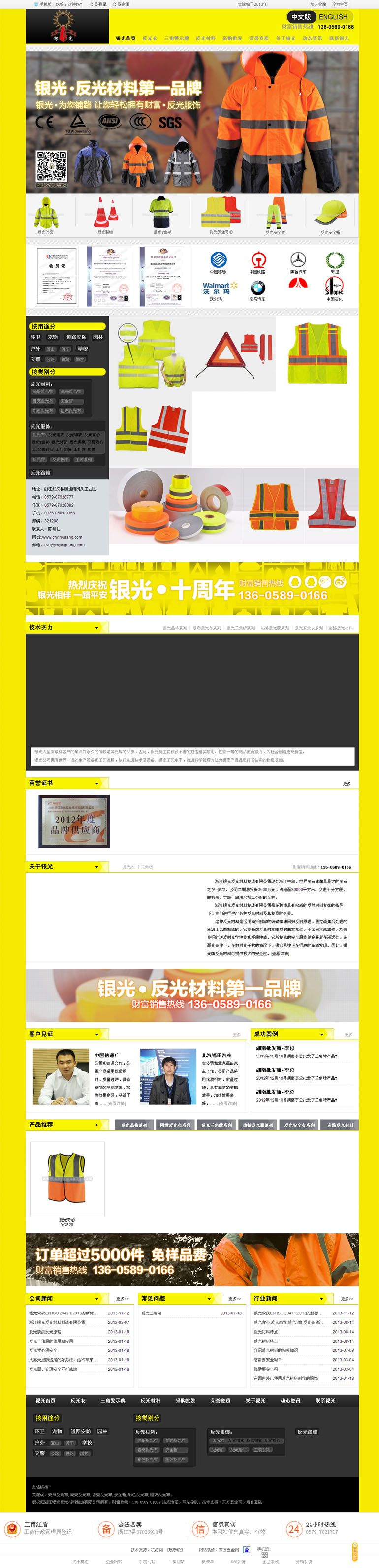 首屏告诉客户我们是反光材料第一品牌,陈列证书和合作企业,以强有力的证据支持自身的言论,打消客户购买的疑虑。