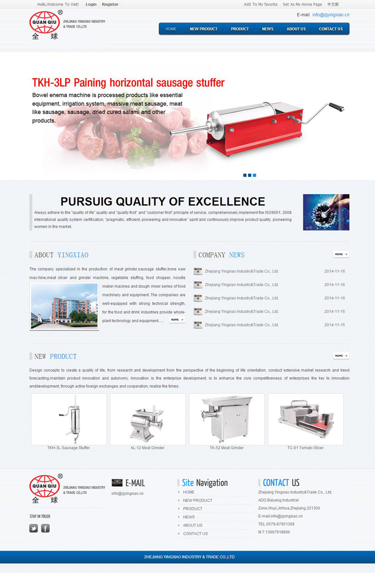 应晓工贸有限公司位于著名的"五金之乡"浙江永康。公司下属有2个工厂,分别在永康与武义。公司拥有资产5000万以上,主要生产食品机械和健身器材两大类,产品先后出口利比亚、蒙古、俄罗斯、朝鲜、越南、孟加拉、埃及、南美及中东等多个国家和地区,并与国内外多家电视购物合作。过硬的产品质量、良好的售后服务树立起了公司精诚、守信的崭新形象。