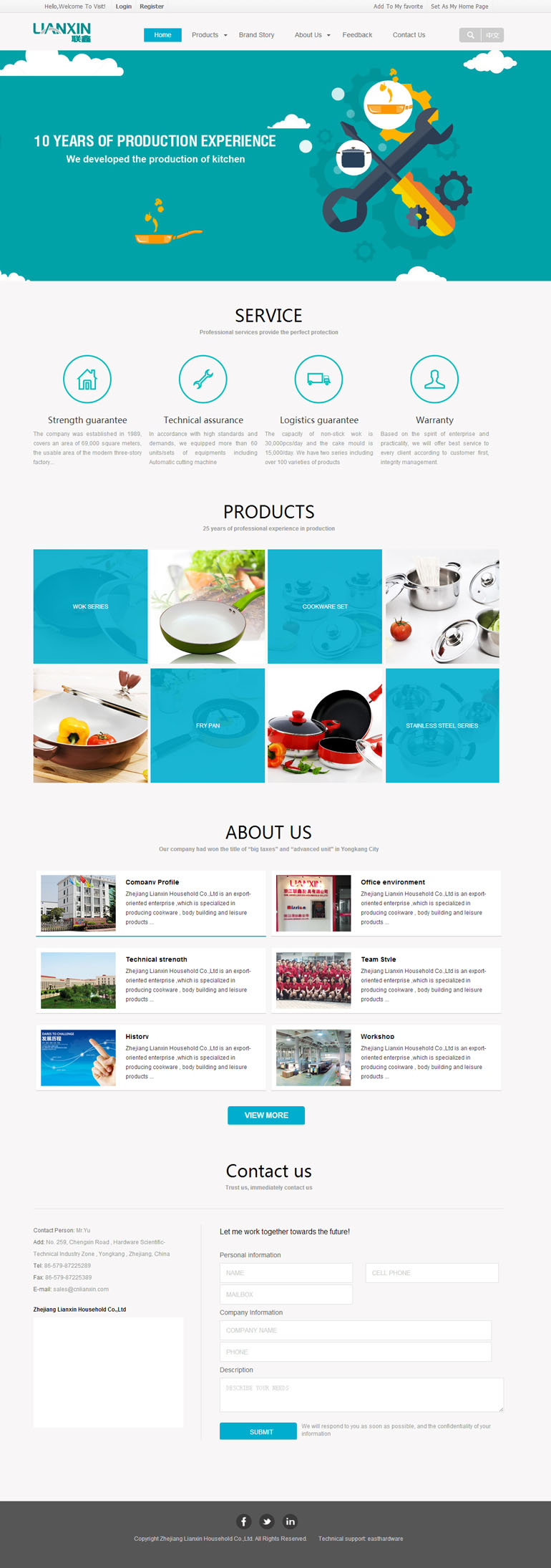浙江联鑫厨具有限公司是专业生产厨具的外贸型企业,公司成立于2002年,占地2万平方米,厂房实用面积4万平方米。公司依照高标准,高要求配置了具有国际先进水平的全自动数控下料机、全自动数控旋压机、全自动喷淋线等六十多台、套设备,具备了日产不粘锅30000只,蛋糕模15000只的产能。现有两大系列产品100多种,远销国内外,公司将持续不断的推出适用于欧洲、美洲、澳洲、日本及其他东南亚国家和地区的产品。