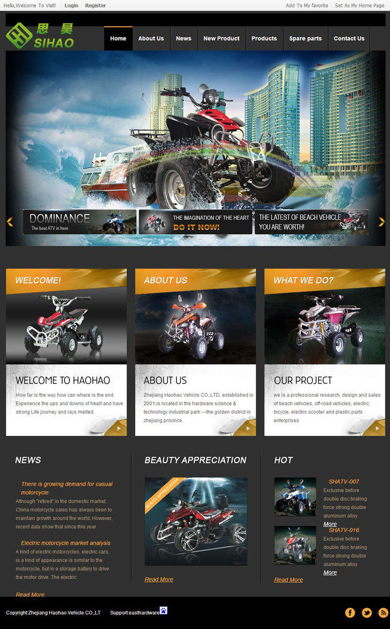 浙江昊昊车业有限公司。成立于2001年,位于中国浙江省五金科技工业园的黄金地段,是专业研究、设计和销售沙滩车、越野车、电动自行车、电动滑板车和塑料零件的企业。公司有独立出口处理权,占地面积50000多平方米,其中楼面面积占28000多平方米,拥有300多名员工,投入机器42台,其中有2套3000克,5套2500克,100克,500克等20个,年销量超过人民币8000万元,年生产能力达32万台。